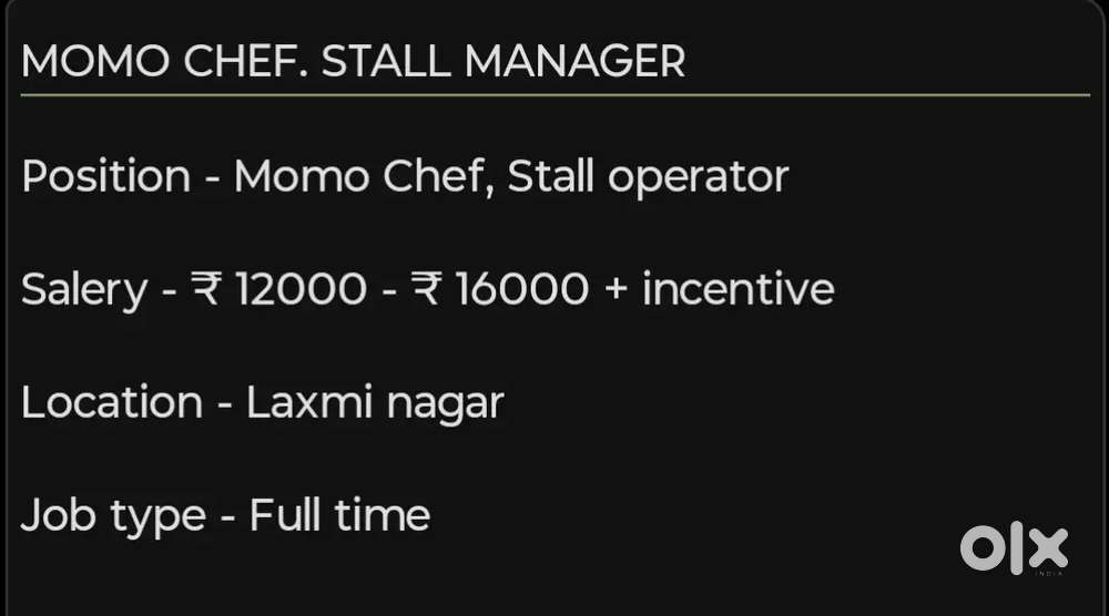 - ₹ 12000 - 16000 | MonthlyStall operator, momo wrapper, momo chefLaxmi Nagar, DelhiToday