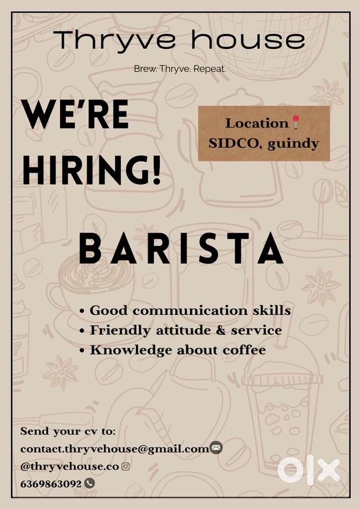 - ₹ 22000 - 25000 | MonthlyBarista for coffee truckGuindy SC Industrial Estate, ChennaiToday