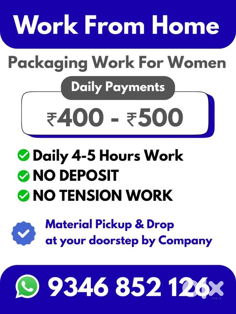 - ₹ 400 - 500 | MonthlyPackaging Work for WomenMehdipatnam, HyderabadToday