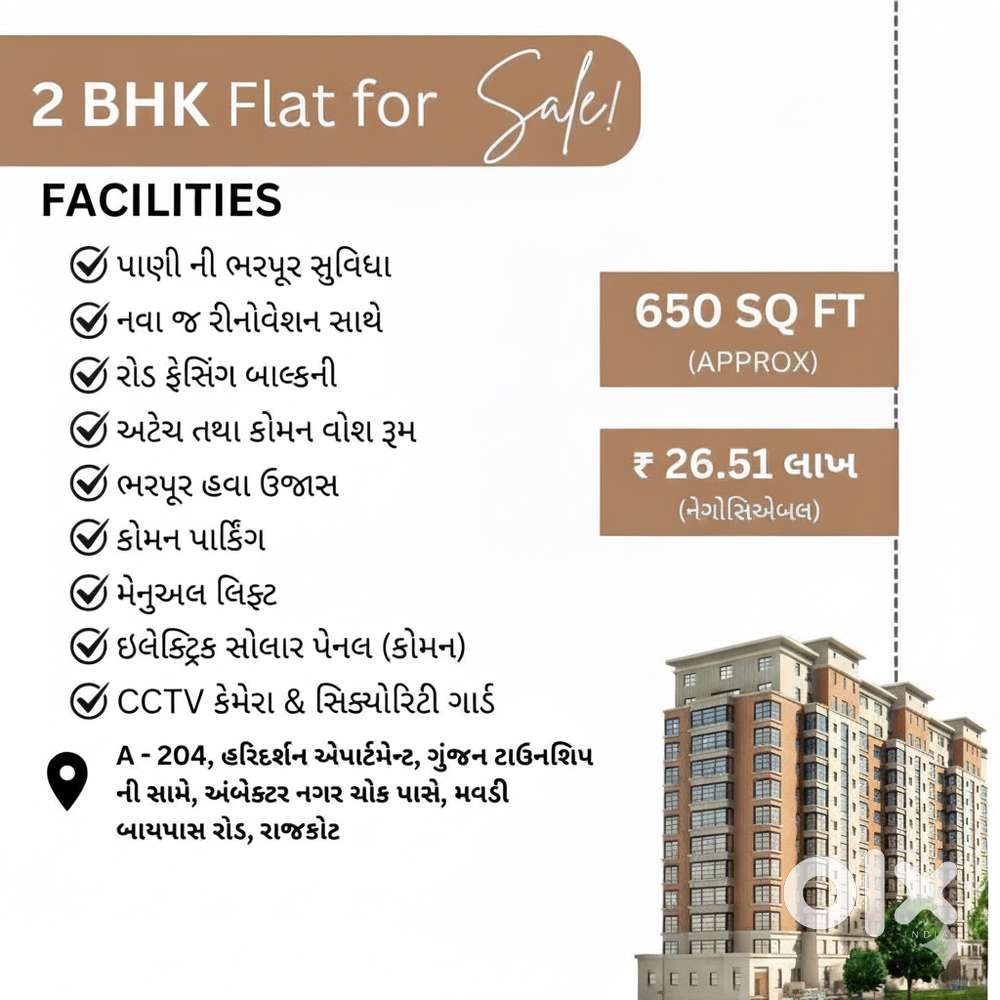 - ₹ 26,51,0002 BHK - 2 Bathroom - 950 sqft2 BHK ફ્લેટ વેચાણ માટે ઉપલબ્ધ – કોઈ બ્રોકરેજ વગર, સીધા માલિક પાસેથીMavdi, RajkotYesterday