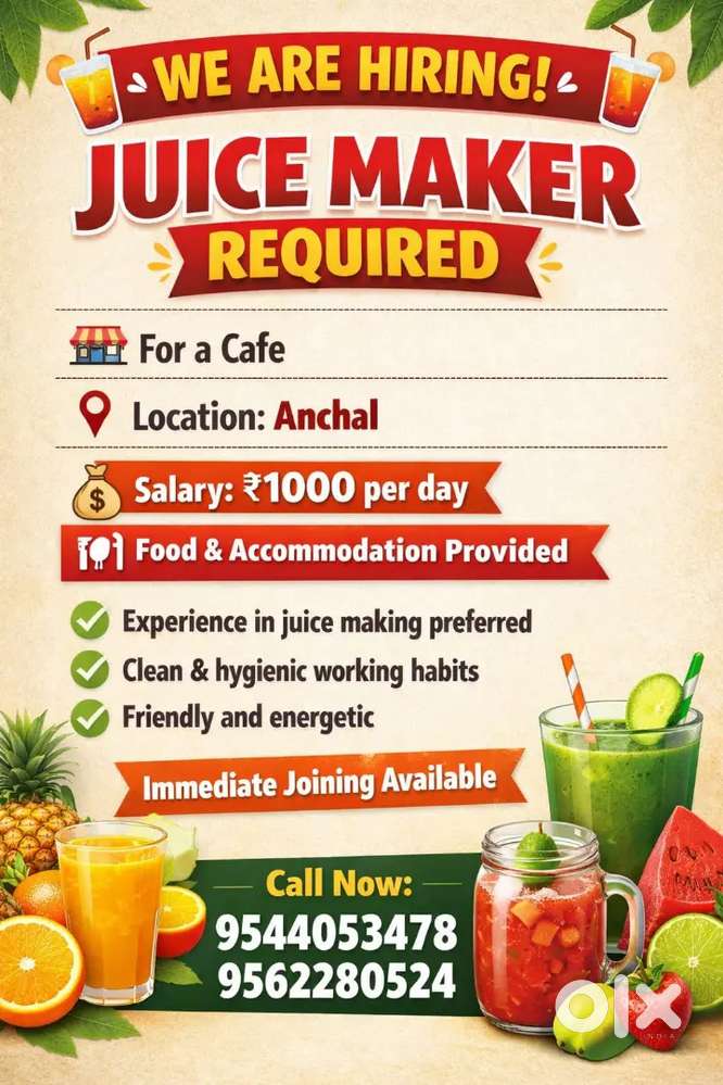 - ₹ 12000 - 15000 | MonthlyJuice and shake maker callAnchal, Kollam1 Dec