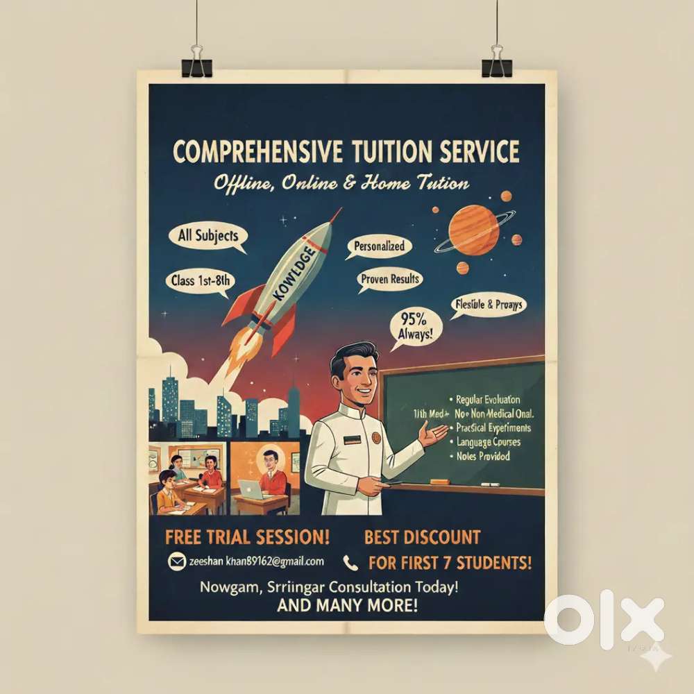 - Providing Home Tuition from Nursery to 8th. DM for further details.Ram Bagh, Srinagar4 days ago