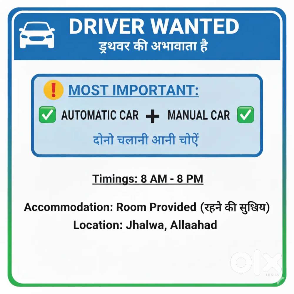 - ₹ 12000 - 16000 | MonthlyPersonal Car Driver (Automatic and Manual)Jhalwa, AllahabadToday