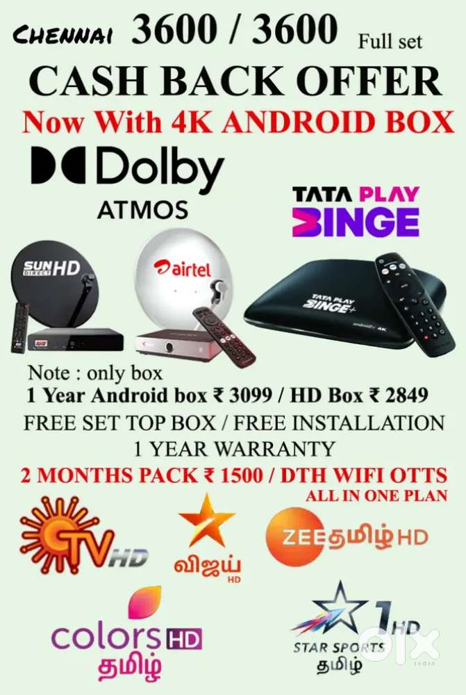 - ₹ 3,600AIRTEL XSTREAM 4K ANDROID BOX ! TÀTA PLÀY ! SUNDIRECT ! DISHTV 1 YEARArumbakkam, ChennaiYesterday