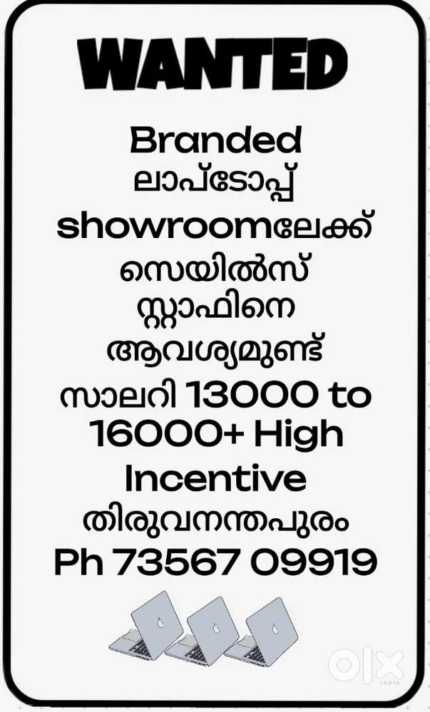 - ₹ 13000 - 16000 | MonthlyBranded ലാപ്ടോപ്പ് showroomലേക്ക് സെയിൽസ് സ്റ്റാഫിനെ ആവശ്യമുണ്ട്Thampanoor, ThiruvananthapuramToday