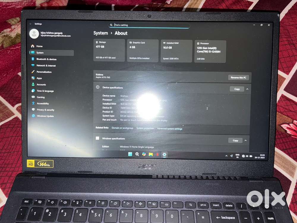 - ₹ 45,000Acer Aspire 7 i5 12th gen 12450H with 16gb RAM 512gb SSD RTX3050 4gbDankuni, HooghlyYesterday