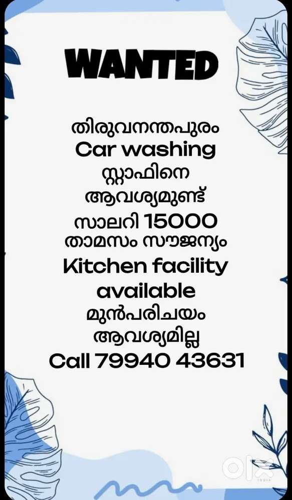 - ₹ 15000 - 17000 | MonthlyCar washing സ്റ്റാഫിനെ ആവശ്യമുണ്ട്Thampanoor, Thiruvananthapuram21 Dec