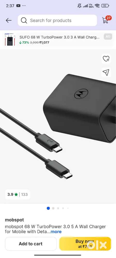- ₹ 1,899Moto charger 90watt brand newMorya Nagar Nalasopara West, Palghar8 Dec