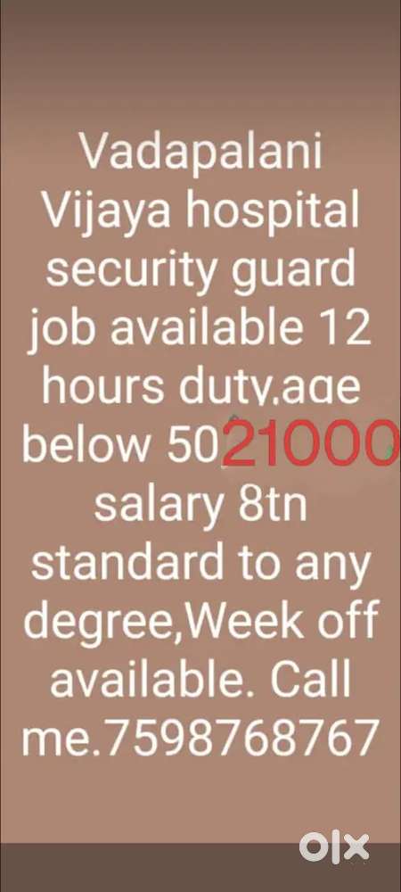 - ₹ 21000 - 24000 | MonthlyVadapalani vijaya hospital security guard's Job available immediateVadapalani, ChennaiToday