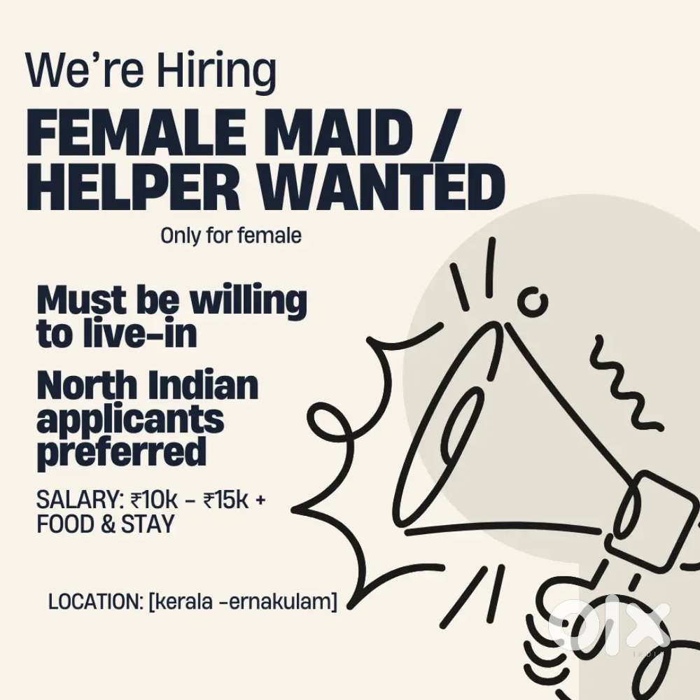 - ₹ 1000 - 4000 | HourlyHome maid job only female age 30 to 45Pachalam, Kochi2 Dec