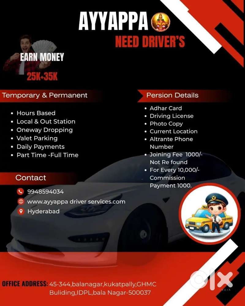 - ₹ 500 - 3000 | HourlyWANTED TEMPORARY All OVER HYD DRIVER'S URGENT REQUIREDKPHB, HyderabadToday