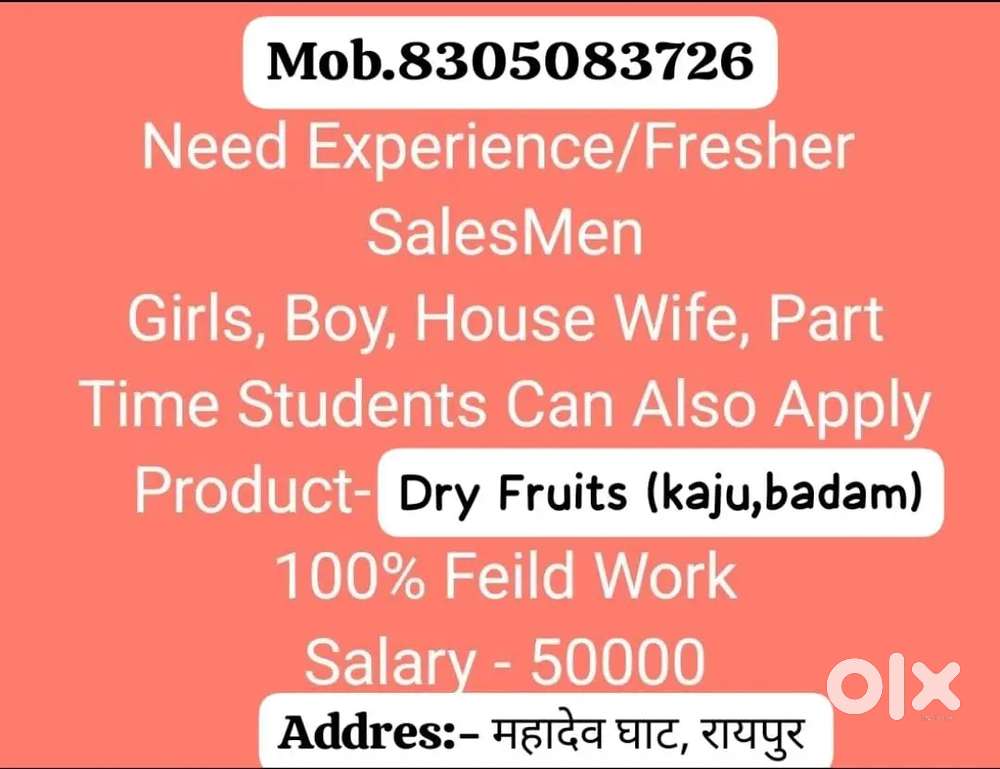 - ₹ 10000 - 20000 | MonthlyField sales and marketingBagicha Para, Raipur4 days ago