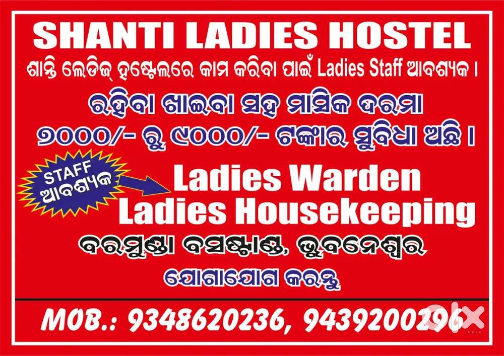 - ₹ 8000 - 10000 | MonthlyLADDIES STAFF REQUIREMENT SHANTI LADDIES HOSTEL BARAMUND BUS STANDBaramunda, BhubaneshwarToday