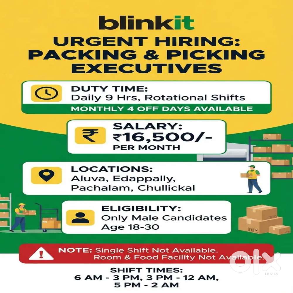 - ₹ 15499 - 16499 | MonthlyThammanam blinkit Packing Picking vacancyKaloor, KochiToday