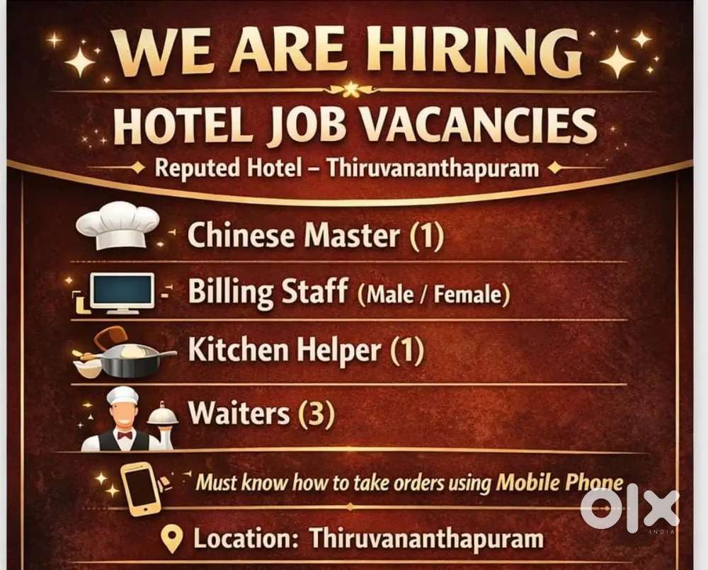 - ₹ 12000 - 25000 | MonthlyLady Cashier & Waiter,Cleaning staff and Indian and Chinese Cookdevaswom board, ThiruvananthapuramToday