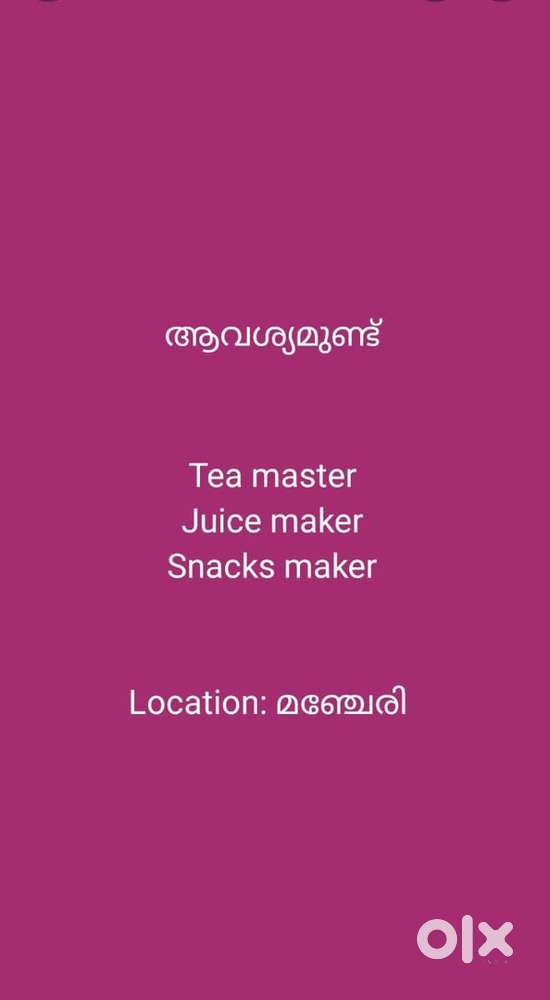 - ₹ 800 - 1000 | Monthlyകടികൾ, ജ്യൂസ്, ചായ ഉണ്ടാക്കാനറിയുന്ന ആളെ ആവശ്യമുണ്ട്. AAluthurupudu, Malappuram5 days ago