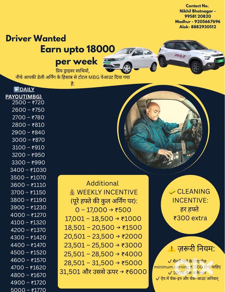 - ₹ 10000 - 12000 | WeeklyDriver hire for rapidoSector 18, Gurgaon3 Dec