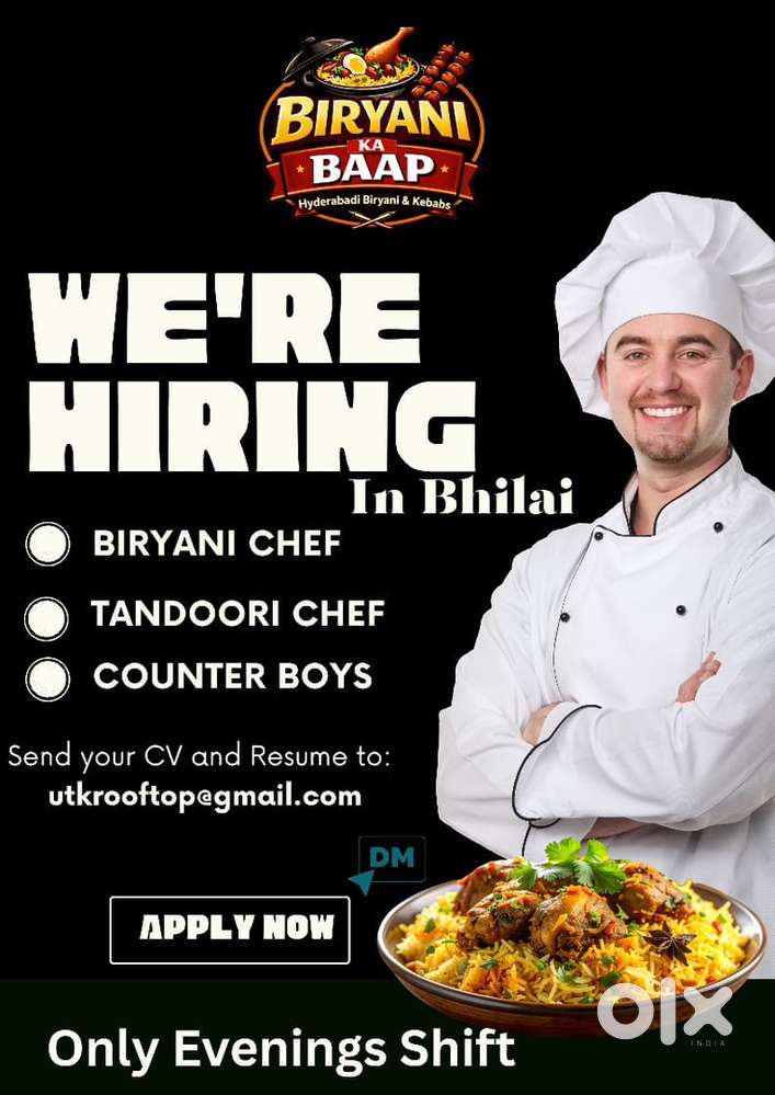 - ₹ 18000 - 22000 | WeeklySpecially need Muslim chef for authentic biryaniSmriti Nagar, BhilaiYesterday