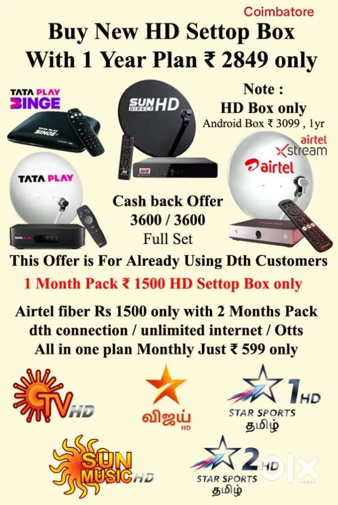 - ₹ 2,849SUNDIRECT ! AIRTEL XSTREAM 4K ANDROID BOX ! TÀTA PLÀY ! DISHTV 1 YEARGanapathi, CoimbatoreToday