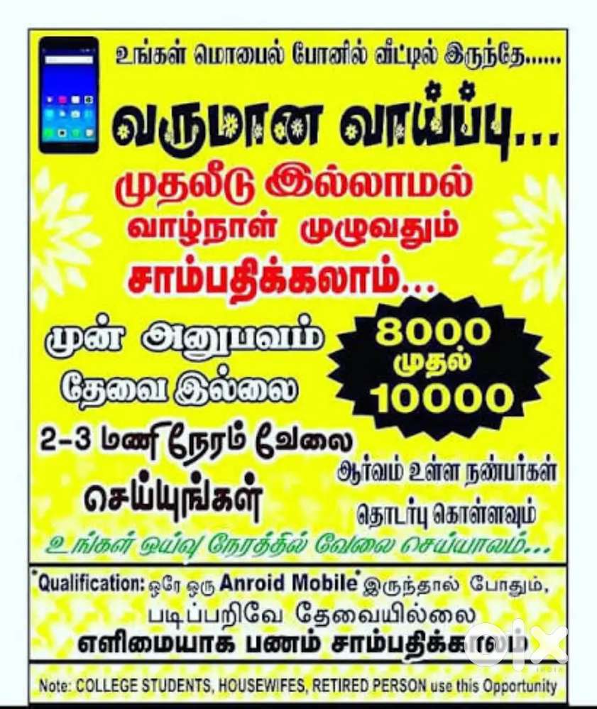 - ₹ 10000 - 25000 | MonthlyPart time full time income oprostySengamala Nachiar Puram, Anaiyur27 Nov