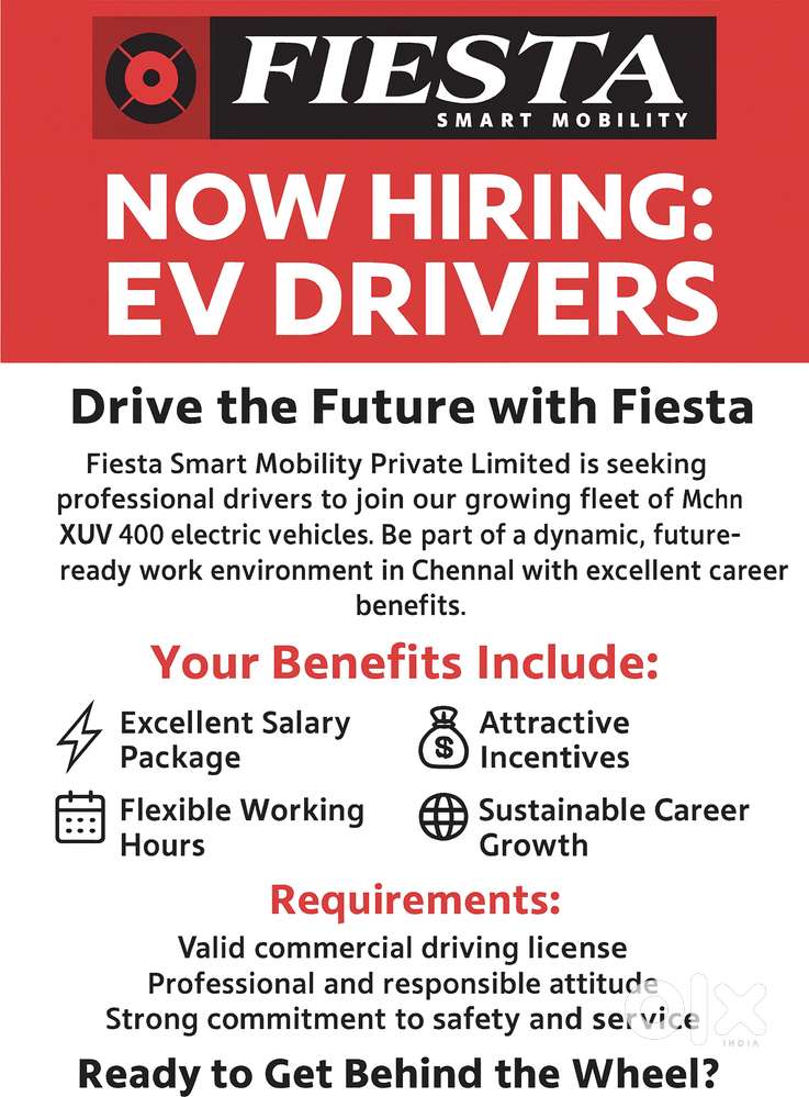 - ₹ 22000 - 28000 | MonthlyNOW HIRING: EV DRIVERS DRIVE THE FUTURE WITH FIESTASunnambu Kolathur, Chennai4 Dec