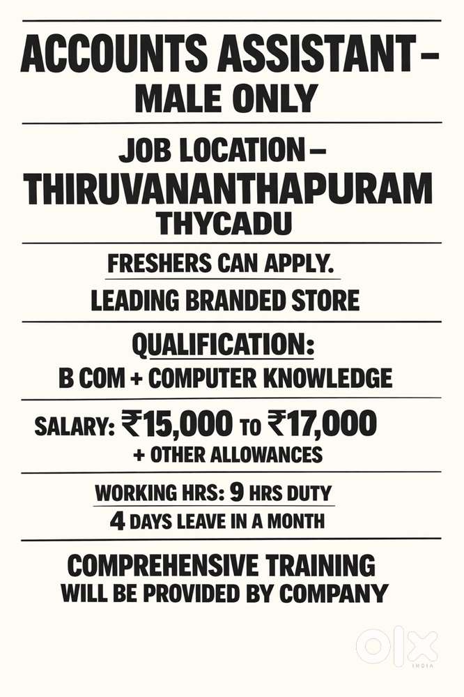 - Today₹ 15000 - 17000 | MonthlyAccunts Assistant MaleThampanoor, Thiruvananthapuram