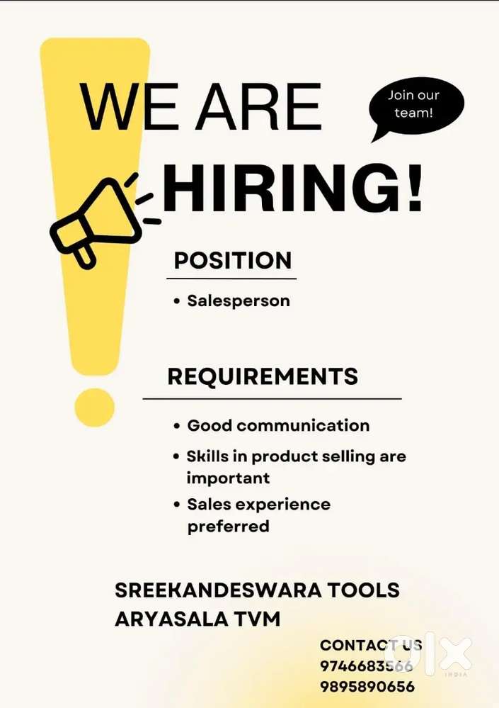 - ₹ 15000 - 20000 | MonthlyPower Tools shop salespersonChalai, Thiruvananthapuram4 Dec