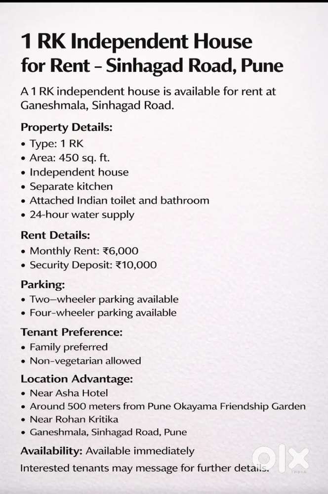 - ₹ 6,0001 BHK - 1 Bathroom - 400 sqft1 RK Independent House for Rent – Sinhagad Road, PuneDattawadi, PuneYesterday