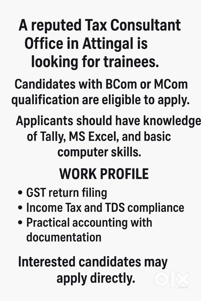 - ₹ 2500 - 3500 | MonthlyWanted –Trainee GST & Income Tax PractitionerAttingal Avanavancherry, AttingalToday