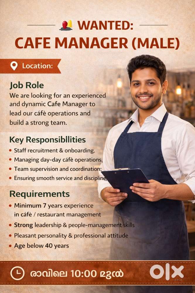 - ₹ 30000 - 35000 | MonthlyWANTED: CAFE MANAGER (MALE) in VarkalaVarkala, KeralaToday