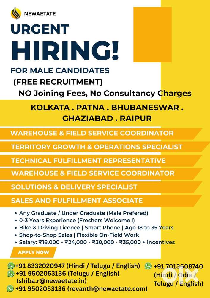 - ₹ 18000 - 35000 | MonthlyField Sales Males Only Bike License Android PhoneUppal Kalan, TelanganaToday