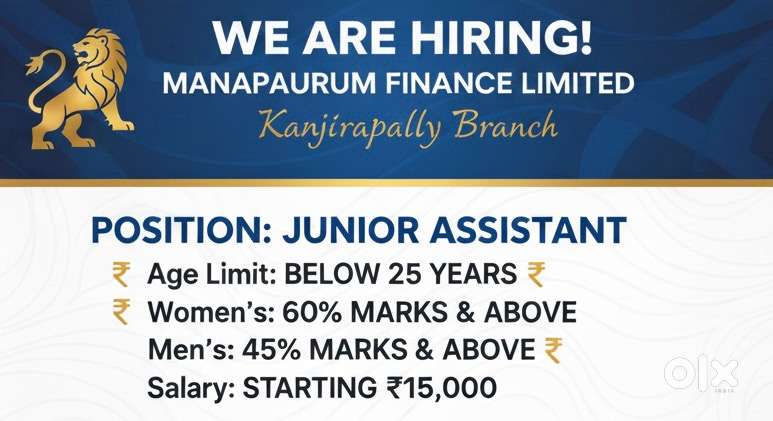 - ₹ 15 - 17500 | MonthlyKanjirappally manappuram finanace jr ass veccancyKanjirapally, KottayamToday
