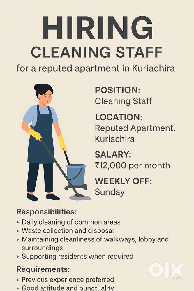 - ₹ 12000 - 13000 | MonthlyHiring: Cleaning Staff for a Reputed Apartment in KuriachiraKuriachira, Thrissur5 Dec