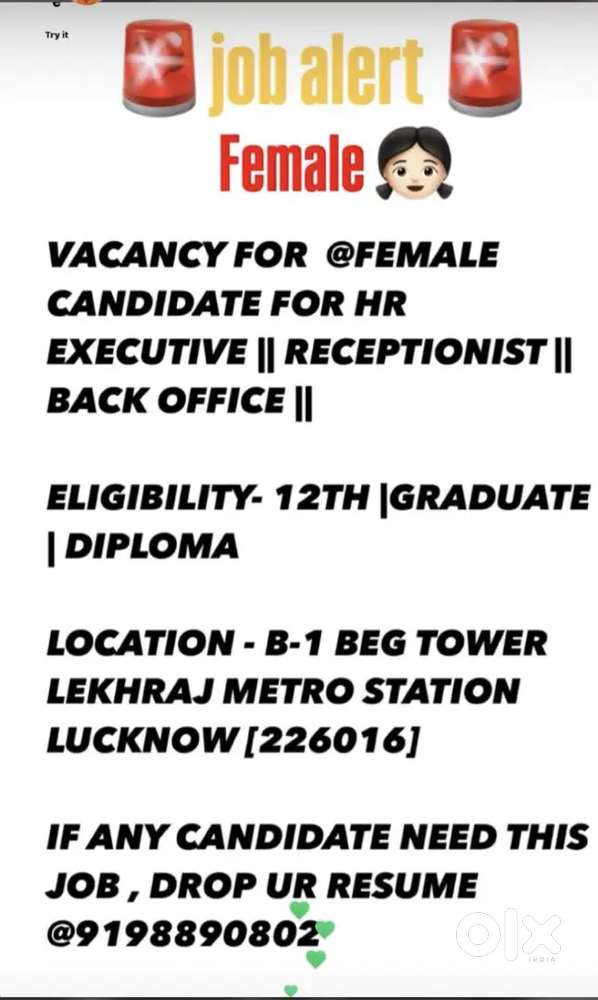 - ₹ 12000 - 15000 | Monthly@FREE JOB IMMEDIATELY JOINNING FOR FEMALEIndira Nagar, LucknowToday