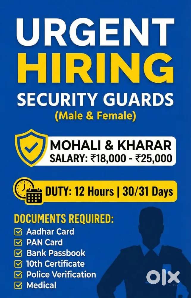 - ₹ 15000 - 30000 | MonthlyURGENT REQUIREMENTS SECURITY GUARD // SECURITY SUPERVISOR // FO // SOSector 64, MohaliToday