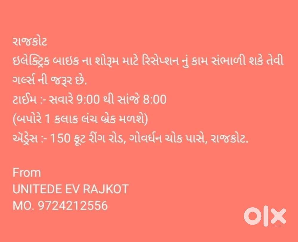 - ₹ 5000 - 10000 | Monthlyરાજકોટ માં ઇલેક્ટ્રિક બાઇક ના શોરૂમ માટે ગર્લ્સ ની જરૂર છે.Mavdi, RajkotToday