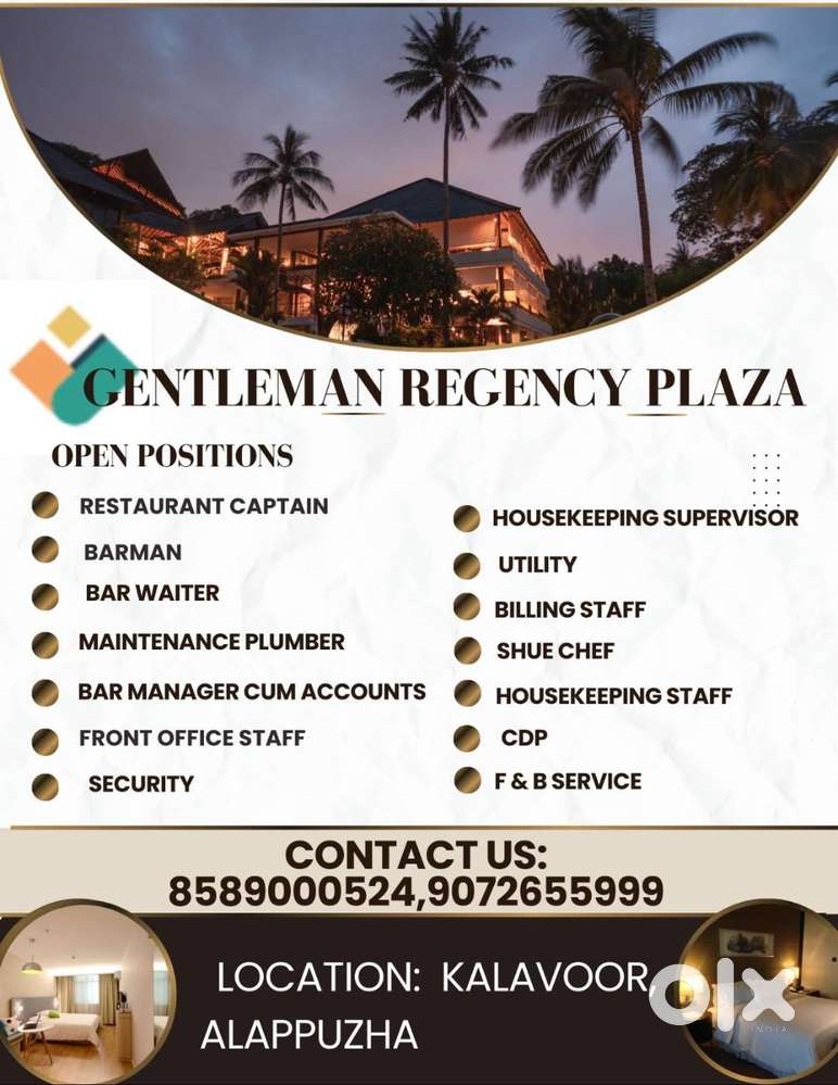 - 5 days ago₹ 15000 - 20000 | MonthlyMale & Female Waiter’s Required for a 3 Star Hotel In Mavelikara.Old Mavelikkara, Mavelikkara