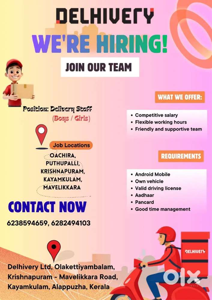 - ₹ 25000 - 35000 | Weeklyകൊറിയർ ഡെലിവറി സ്റ്റാഫിനെ ആവശ്യമുണ്ട്Mavelikara, Mavelikkara9 Dec