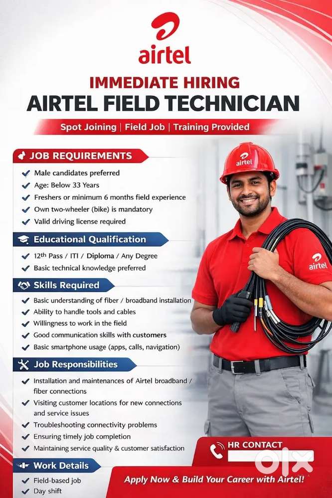- ₹ 30000 - 35000 | MonthlyAirtel Fibre Maintenance Technician – Immediate Hiring Bike mustKoyambedu, Chennai18 Dec