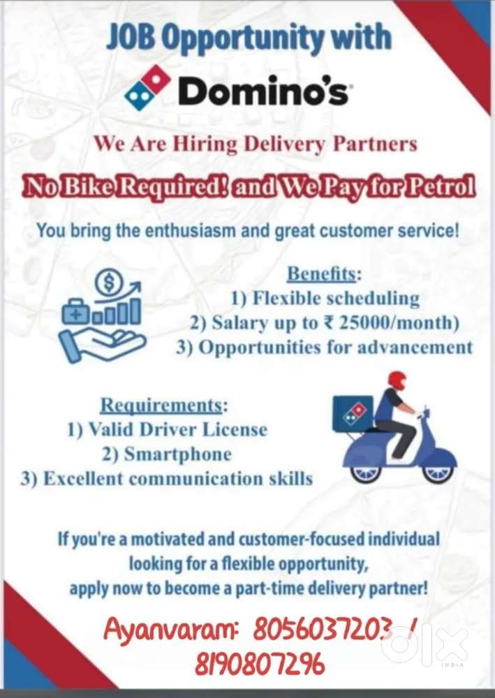 - ₹ 25000 - 30000 | MonthlyWe are hiring Delivery Boy in Domino'sKorattur, ChennaiToday