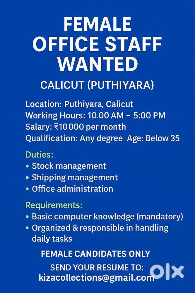 - ₹ 9000 - 12000 | MonthlyOffice Staff (recommended for female)Moozhikal, Kozhikode18 Dec