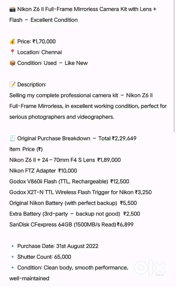 - ₹ 1,70,000Nikon Z6 II Mirrorless Camera Full Kit AccessoriesVelacheri, ChennaiToday