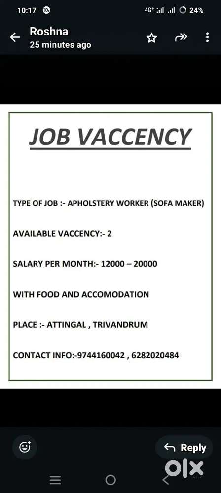 - ₹ 12000 - 24000 | MonthlyUpholstery Worker (sofa maker) near Attingal TrivandrumAnchal, Kollam20 Dec