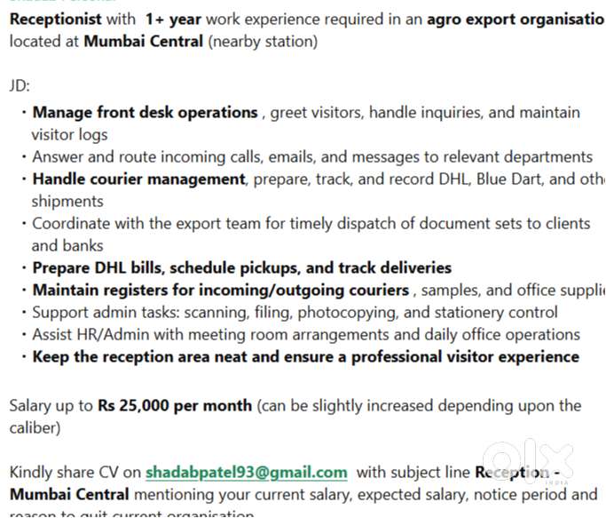 - ₹ 15000 - 25000 | MonthlyUrgent vacancy receptionAiroli, Navi Mumbai10 Dec