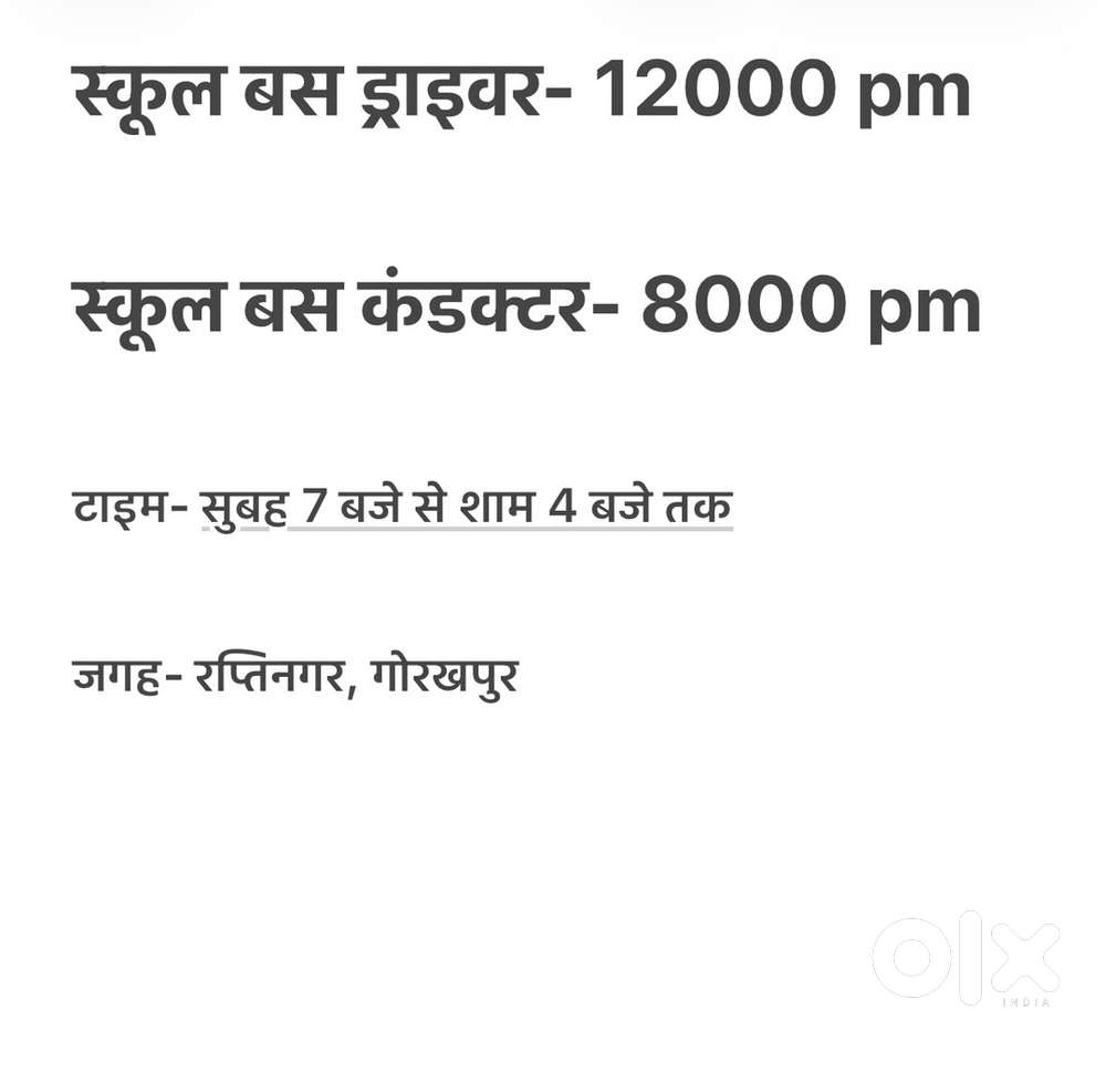 - ₹ 10000 - 12000 | Monthlyस्कूल में बस ड्राइवर और बस कंडक्टर की आवश्यकता हैRapti Nagar, Gorakhpur26 Nov