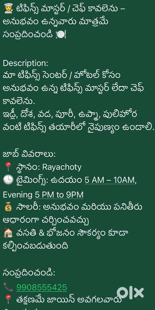 - టిఫిన్స్ మాస్టర్ / చెఫ్ కావలెనుS N Colony, Rayachoti3 days ago