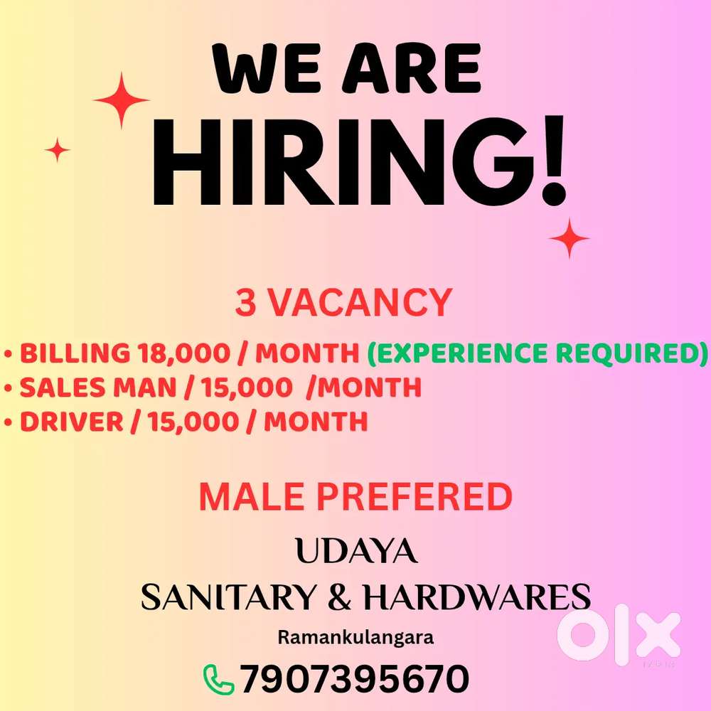 - ₹ 15000 - 18000 | MonthlyBilling ,Driver ,sales manTagore Nagar, KollamToday