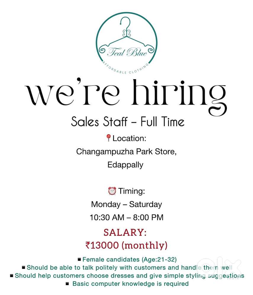 - ₹ 13000 - 13000 | MonthlySALES STAFF- WESTERN WEAR STOREKochi, KeralaToday