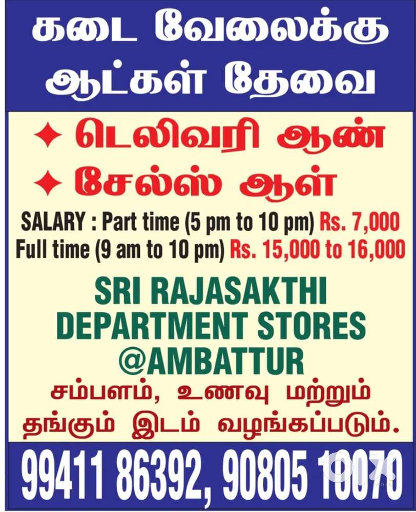 - ₹ 15000 - 15000 | MonthlyOut door salesTuckerammalpuram, TirunelveliYesterday