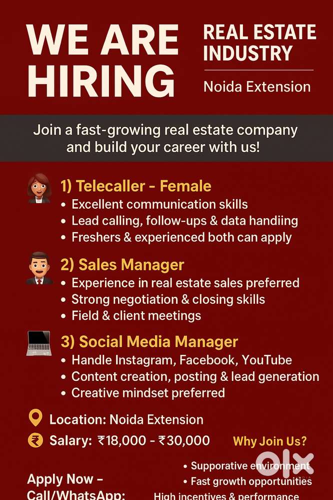 - ₹ 15000 - 25000 | MonthlyWE ARE HIRING – REAL ESTATE PROFESSIONALSNoida Extension, Greater NoidaToday